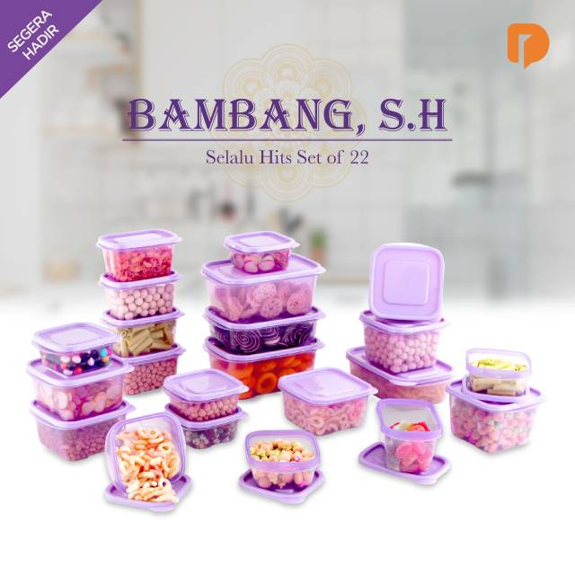 BAMBANG S.H SET 22Bambang S.H. Selalu Hits merupakan wadah multifungsi. Bisa digunakan untuk menyimpan snack, bahan masakan, sayuran/buah, bahkan perlengkapan lain seperti alat tulis dan aksesoris agar bahan makanan tetap terjaga kualitasnya dan tertata rapih.Keunggulan produk :Wadah multifungsiBisa untuk menyimpan berbagai jenis bahan masakan, snack, sayuran/buah, hingga accesories.1 set terdiri dari 22 piecesMaterial PP5, BPA Free, dan food gradeTidak perlu khawatir, dengan material yang berkualitas Bambang aman untuk segala jenis makananFreezer safeAman dimasukkan ke dalam freezer.Microwave safeAman dimasukkan ke dalam microwave.Stackable Mudah ditumpuk saat tidak digunakan, hemat ruang penyimpananWarna ungu yang super fresh, eye catchy, dan manis banget!1 set Bambang S.H isi 22 pcs:2 pcs kapasitas 1.400 ml2 pcs kapasitas 1.000 ml3 pcs kapasitas850 ml3 pcs kapasitas 700 ml5 pcs kapasitas 450 ml7 pcs kapasitas 270 ml#foodstorage#wadahserbaguna#tempatmakan#perlengkapandapur#bambang