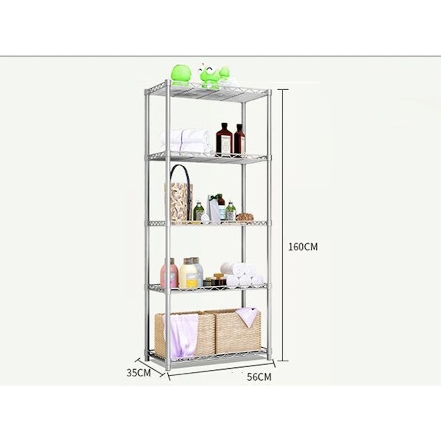 Bahan baja karbon kualitas tinggi, tahan panas, ramah lingkungan, anti karat,Serbaguna,dapat digunakan di balkon ,dapur ,kamar tidur dan kamar mandiDapat menahan beban maksimal 80KgDengan rak 5 tingkat ini penyimpanan yang rapi dan dapat meletakan banyak barangUkuran:56cm X 35cm X