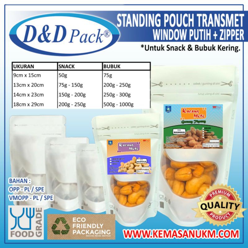 Stand up pouch transmet kombinasi window Putih + Zipper Tersedia ukuran :9x15cm 13x20cm14x23cm18x29cmBahan : Front: PET/SPEBack & Bottom : PET/VMPET/SPETebal : Depan +- 80mikron dan belakang +-90mikronModel : Standing Pouch Fitur : Zipperlock, FoodgradeNB : Pemesanan Min. 10pcs dan kelipatann