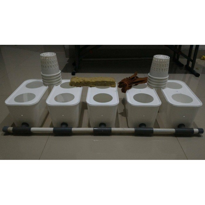 Stok Tersedia. Berat pengiriman 3000gram.Dibuat dari bahan ember/pot berkualitas derajat makanan atau foodgrade. Dimensi ember/pot sekitar 15 x 14 x 30 cm.Menggunakan ember es krim kemasan 5liter warna putih tidak transparan dan permukaan datar.Dilubangi pada bagian bawah untuk sambungan tee agar dapat tersambung secara utuh dengan ketinggian 2cm. Memudahkan dalam mengontrol jumlah nutrisi dan saat perawatan pot.Juga dilubangi 5cm dari atas ember sebagai fitur autospill, jika ada kelebihan air terbuang secara otomatis dan mencegah akar tanaman terendam air terus menerus.Dilengkapi dengan netpot 10cm, warna tergantung persediaan dan sumbu sehingga tidak perlu repot.Paket ini cocok untuk pengembangan sistem wick/sumbu namun dengan ember/pot yang terintegrasi. Kontrol nutrisi yang lebih mudah karena tersambung satu sama lain. Fitur autospill mencegah akar terendam terus-menerus dan ember/pot yang tidak transparan dapat mencegah pertumbuhan lumut.Dapat dikembangkan menjadi dutch bucket.Beberapa paket bisa dikembangkan atau disambungkan untuk skala yang lebih besar.Paket ini siap pakai. Tinggal lakukan pembenihan dan penambahan air nutrisi.Paket terdiri dari:- 5 buah ember 5lt lengkap dengan tutupnya dn dilubangi 1/2 titik x 5- 2 buah x 6cm Pipa pvc 1/2" sambungan ujung pot- 4 buah x 13cm Pipa pvc 1/2" sambungan antar pot- 5 buah sambungan tee drat 1/2"- 5 buah nipple drat 1/2"- 2 dop polos dikedua ujung 1/2"- 5/10 buah netpot besar 10cm- 5/10 lembar sumbu flanel.Default/standarnya 1 lubang. Tulis diketerangan jika ingin 2 lubang.Rockwool hanya sebagai ilustrasi & bukan bagian dari paket penju