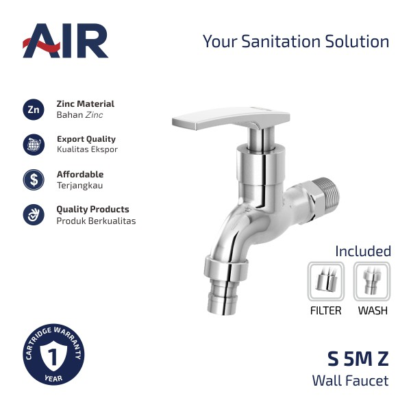 Deskripsi AIR Kran Air Keran Tembok Wall Faucet S 5M Z[READY STOK]Estimasi pengiriman: Jabodetabek 4-7 hari kerja, luar Jabodetabek 5-14 hari kerja. Order masuk > jam 11.00 ikut pengiriman besok (termasuk JNE YES).- Kran tembok air dingin untuk instalasi pipa 1/2 inch- Bentuk design simple dengan handle berbentuk stick- Memiliki warna chrome yang mengkilap- Ekonomis dan mudah dalam pemasangan- Panjang x lebar x tinggi: 11 cm x 7 cm x 10 cm- Ujung kran bisa disambungkan dengan selang mesin cuci dan tidak bocor- Cara pakai nya adalah dgn memutar posisi stang dari posisi semula ke arah berlawanan jarum jam 90 derajat dari off ke on- Perbedaan dengan S 5L NZ adalah S 5M NZ tidak ada lengkung ke atas di bagian ujung handle nya. S 5L NZ ada sedikit lengkung ke atas di bagian ujung handle