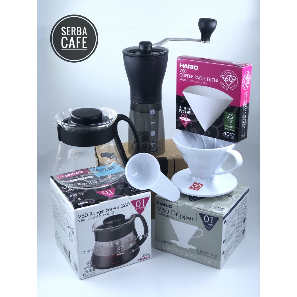 Paket Hario Manual Brew PAS MANTAP:1. Hario V60 01 White / Red / Clear (VD-01W/VD-01R/VD-01T) / V60 02 White / Red / Clear(VD-02W/VD-02R/VD-02T)2. Hario Server 450 ml (VCS-01B)3. Hario Paper Filter 01 / 02 (VCF-01-40W / VCF-02-40W) 4. Hario Ceramic Slim Grinder Matte WHITE (MSS-1-MW-V)PERHATIAN BARANG PECAH BELAH!! KAMI AKAN SELALU MELAKUKAN DOUBLE WRAPPING UNTUK SETIAP BARANG YANG DIKIRIM. APABILA PECAH MOHON UNTUK LANGSUNG KOMPLAIN KE PERUSAHAAN KURIR YANG DIPILIH APABILA URGENT. KAMI HANYA BISA MEMBANTU CLAIM ASURANSI PENGIRIMAN YANG DISEDIAKAN SHOPEE. SEKIAN DAN TERIMA KASIHPengiriman menggunakan GOJEK atau GRAB SAME DAY diatas jam 2 berpotensi sampai