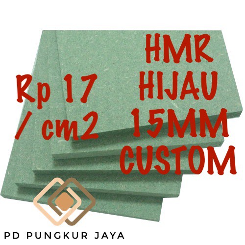 Deskripsi MDF HIJAU / HMR (TAHAN AIR) 15 MM CUSTOMHMR 9mm custom ukuran sesuai kebutuhan AndaCARA PERHITUNGANPanjang x Lebar x Rp 17MINIMUM ORDER ADALAH Rp 50,000CONTOH:30cm x 40cm x Rp. 17 = Rp 20,40050,000 ÷ 20,400 = 3 potongan (PEMBULATAN KE ATAS)20,400 x 3 = 61,200Total = Rp 61,000Jumlah yang di input = 61,000 ÷ Rp 1000 = 61 unitPembulatan 1001-1500 diibulatkan menjadi 1000Pembulatan 1501 - 1999 dibulatkan menjadi 2000Dapat dipotong segala ukuran sesuai kebutuhanUntuk permintaan ukuran custom, proses sekitar 1-2 hari setelah pembayaran.Sisa bahan potong dapat dimasukan kedalam pengiriman by req