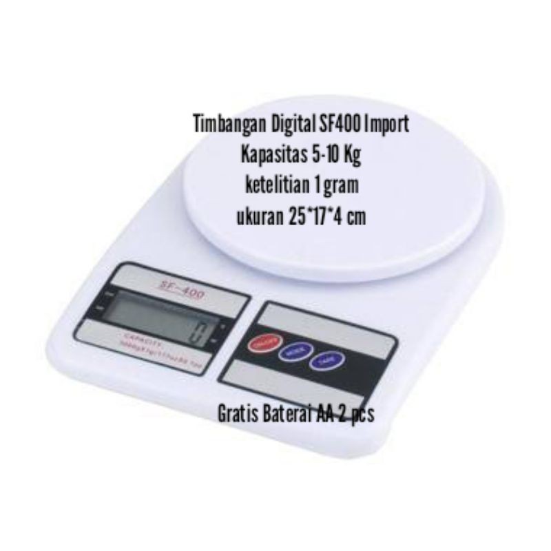 Semua produk sudah di lakukan tes running dan dalam posisi bagus atau berfungsi dengan baikJadi setelah order tidak dapat di RETURN yah kakSpesifikasi1. Kapasitas 5 - 10 Kg2. Ketelitian 1 Gram3. Ukuran 25 x 17 x 4 cm4. Bonus 2 Baterai AA 2 PcsKelebihan 1. Otomatis Off bila tidak di pakai2. Indikator Layar Digital 3. Indikator Muncul "EEEE" Bila melewati kapasitas4. Push Tombol Tare bila ingin memakai wadah apa saja sampai indikator muncul angka "0" 5. Cocok untuk timbangan kue, snack, gula dllMakacii