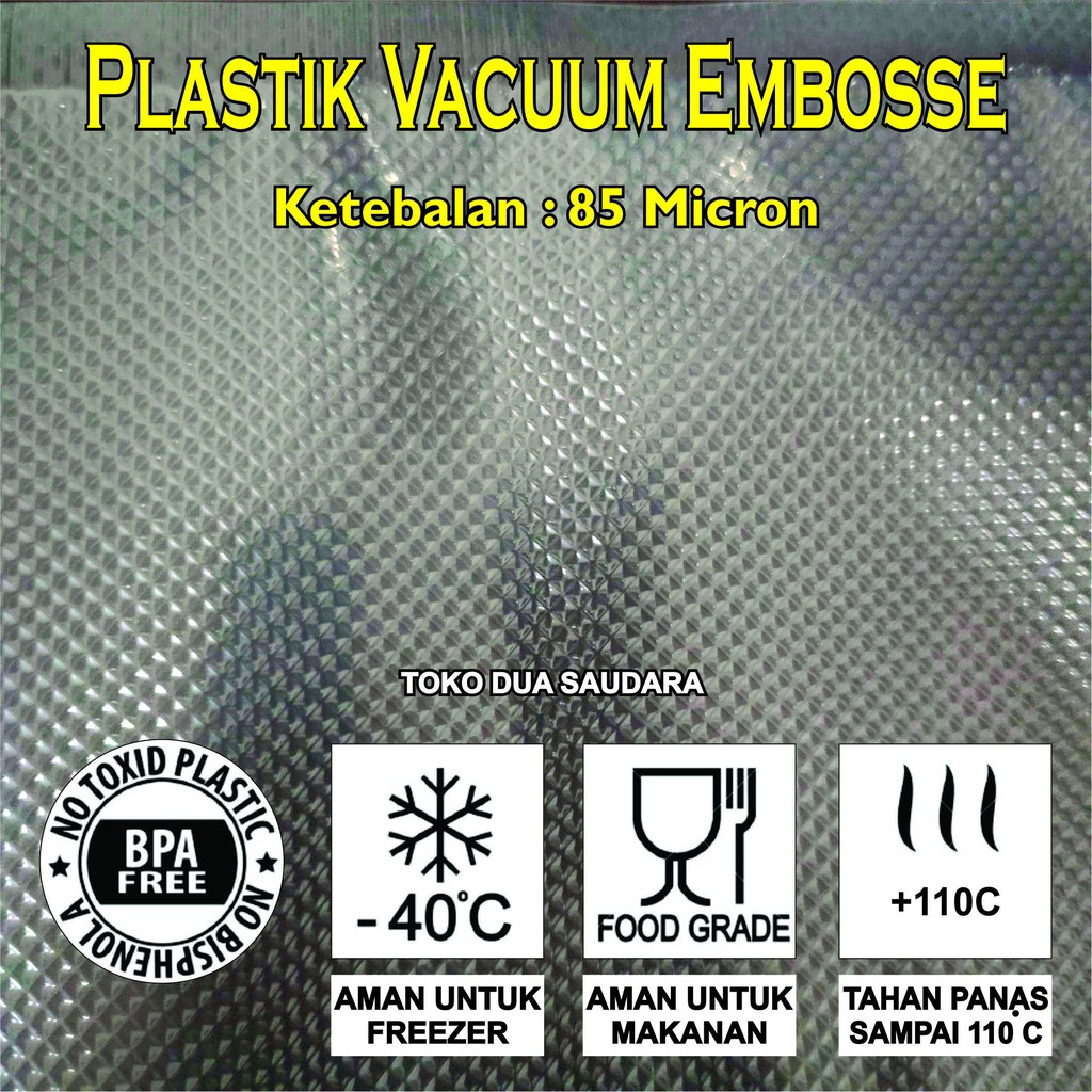 Plastik vacuum bag embossed / vakum sealer makanan ukuran 15x20cmPlastik Vacuum Bags Makanan untuk mesin Vacuum Sealer agar makanan awet dan HigienisHarga tertera harga per 50pcs*** 1 SISI EMBOSSED (KASAR), 1 SISI HALUS ***Bahan : Plastik PE+PA ( Food Grade), Ramah Lingkungan, BPA freeMotif : Embosse/Texture ( Lebih maximal dalam mengeluarkan oksi